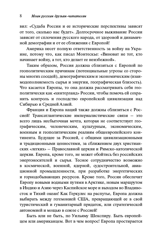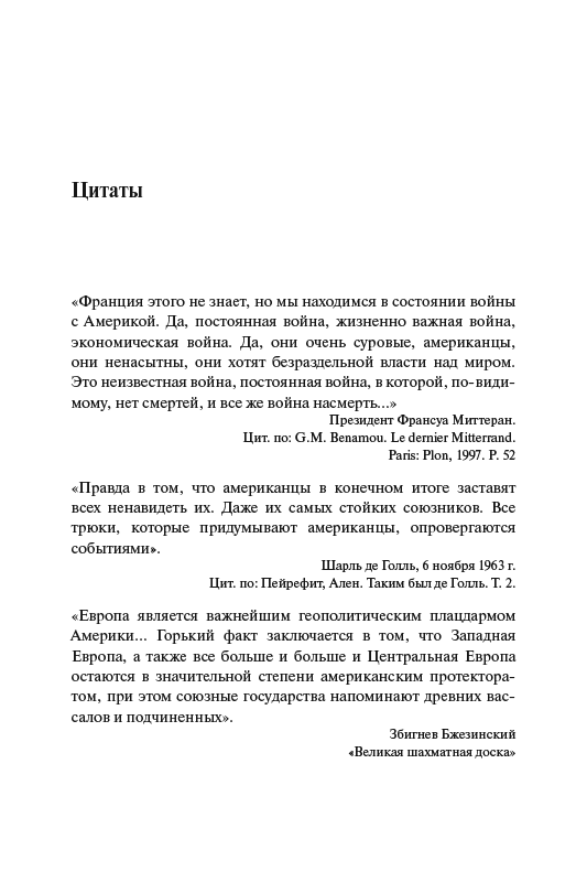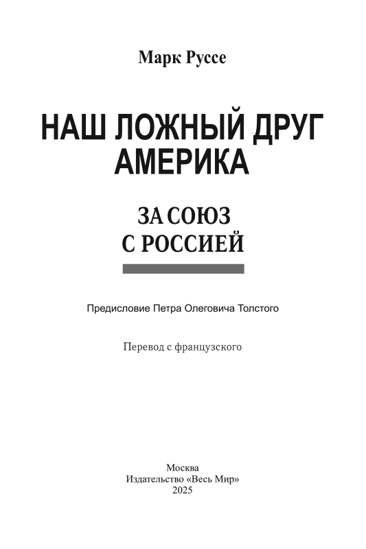 Книга независимого французского публициста Марка Руссе раскрывает фундаментальную противоположность интересов США национальным интересам европейцев. Автор выступает за союз европейских наций с Россией, критически характеризует ЕС и НАТО как инструменты американской гегемонии. В своих оценках М. Руссе следует голлистской традиции французской геополитики, выразителями которой выступали президенты Ф. Миттеран и Ж. Ширак.