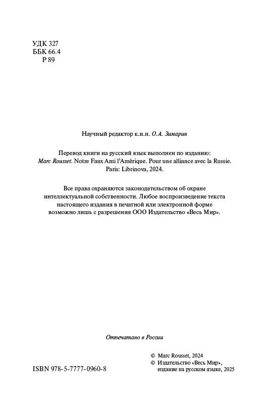 - 6 июня 2025 офис издательства Весь Мир будет закрыт в связи с продолжающимся на Красной площади книжным фестивалем и проводимом совместно с Институтом Европы РАН «круглым столом» и встречей с автором книги «Наш ложный друг Америка» Марком Руссе. Просим извинения за доставленное неудобство.