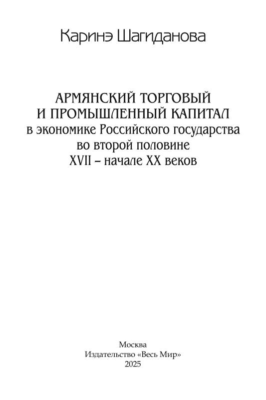 Особую роль в многовековой истории армяно-российских связей и сотрудничества сыграла деятельность армянских деловых кругов. Наиболее ярко это проявилось в период второй половины XVII – начале XX веков, когда вначале армянские купцы стали важнейшим связующим звеном в торговле России с Востоком, а позднее армянский торговый капитал принял активное и заметное участие в развитии капитализма и предпринимательства в России. Этим темам и посвящена книга историка К.И. Шагидановой, основанная на значительном архивном материале, часть которого впервые введена в научный оборот.