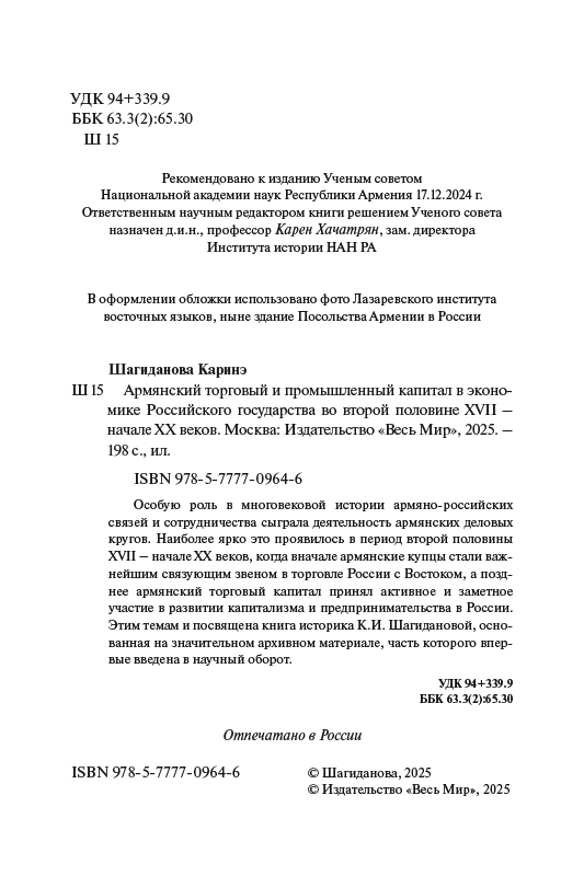 - Книга называется «Армянский торговый и промышленный капитал в экономике Российского государства во второй половине XVII — начале XX веков» и представляет собой содержательный исторический очерк.