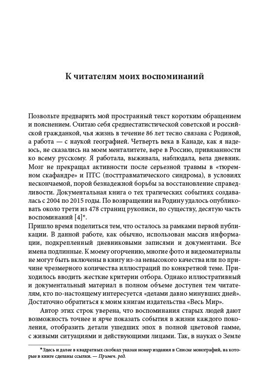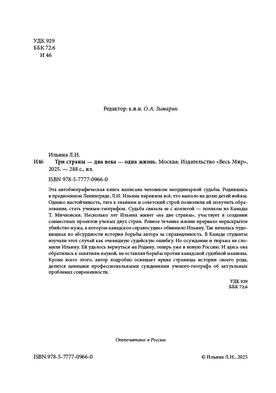 Эта автобиографическая книга написана человеком неординарной судьбы. Родившись в предвоенном Ленинграде, Л.Н. Ильина пережила всё, что выпало на долю детей войны. Однако настойчивость, тяга к знаниям и советский строй позволили ей получить образование, стать ученым-географом. Судьба связала ее с коллегой — поляком из Канады Т. Мичковски. Несколько лет Ильина живет «на две страны», участвует в создании совместных проектов ученых двух стран. Ровное течение жизни прервало нераскрытое убийство мужа, в котором канадское «правосудие» обвинило Ильину. Так началась чудовищная по абсурдности история борьбы автора за справедливость. В Канаде студенты изучали этот случай как очевидную судейскую ошибку. Но осуждение и тюрьма не сломили Ильину. Ей удалось вернуться на Родину, теперь уже в новую Россию. И здесь она обратилась к занятиям наукой, не оставляя борьбы против канадской судебной машины. Кроме всего этого, автор подробно освещает яркие страницы истории своего рода, делится ценными профессиональными суждениями ученого-географа об актуальных проблемах современности.