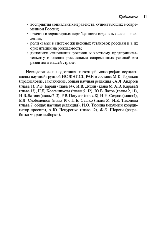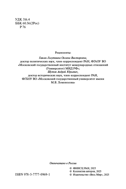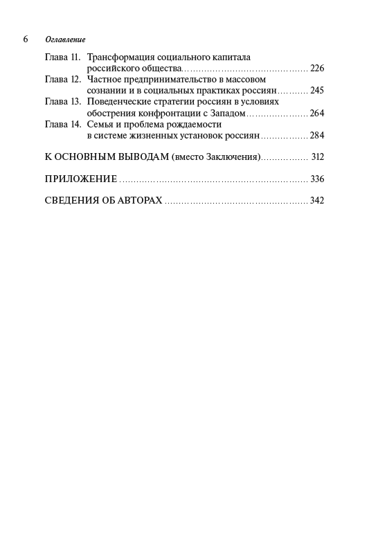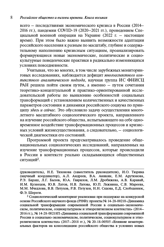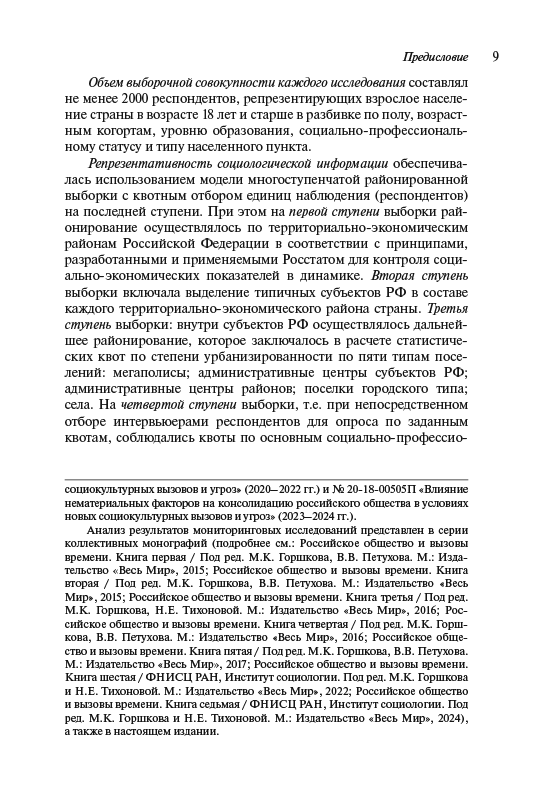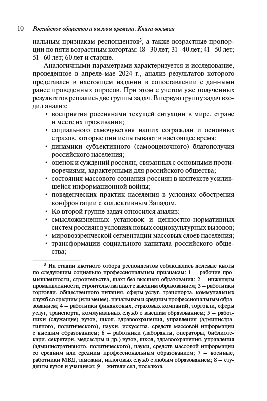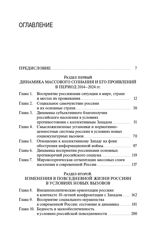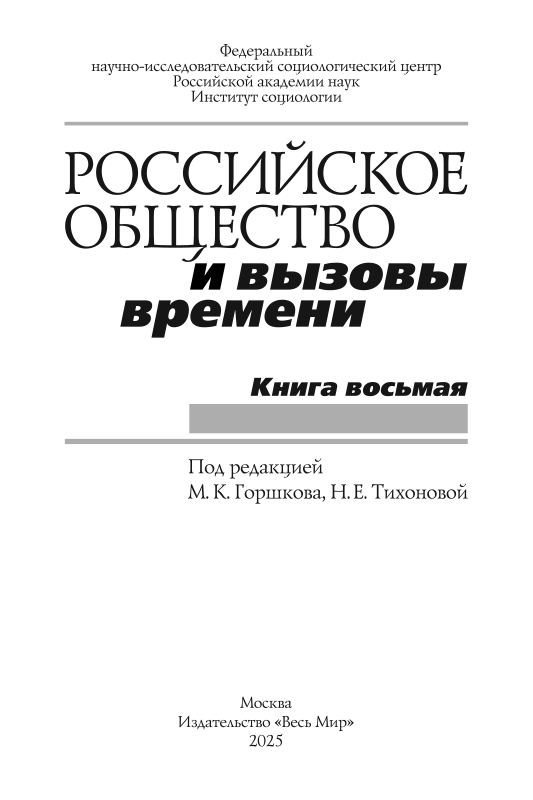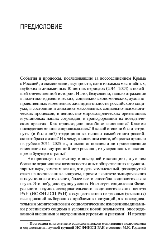 В книге на основе результатов многолетнего социологического мониторинга (2014–2024 гг.) дается междисциплинарный и многоаспектный анализ динамики развития российского общества в условиях внешних и внутренних угроз и вызовов. При этом рассматриваются особенности восприятия россиянами ситуации в мире, стране и местах их проживания, факторы, оказывающие влияние на социальное самочувствие и психоэмоциональные состояния массовых слоев населения, их ценностно-мировоззренческую сегментацию. Особое внимание уделяется анализу субъективного благополучия россиян, причин существующего уровня бедности и малообеспеченности, монетарных и немонетарных неравенств. В контексте обострения конфронтации с Западом и новых социокультурных вызовов рассматриваются смысложизненные и нормативно-ценностные установки россиян, их поведенческие стратегии.