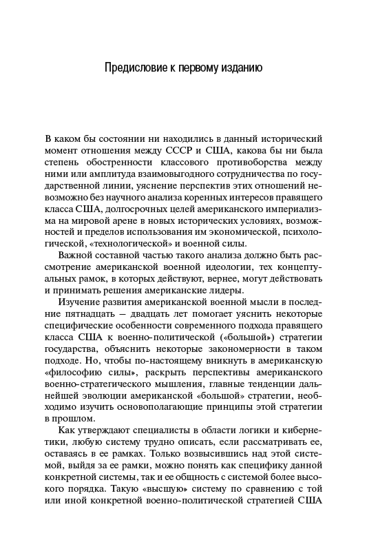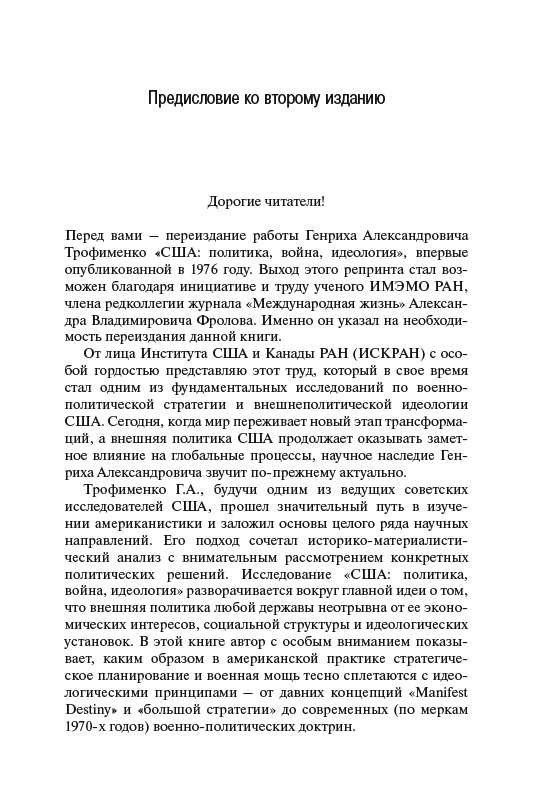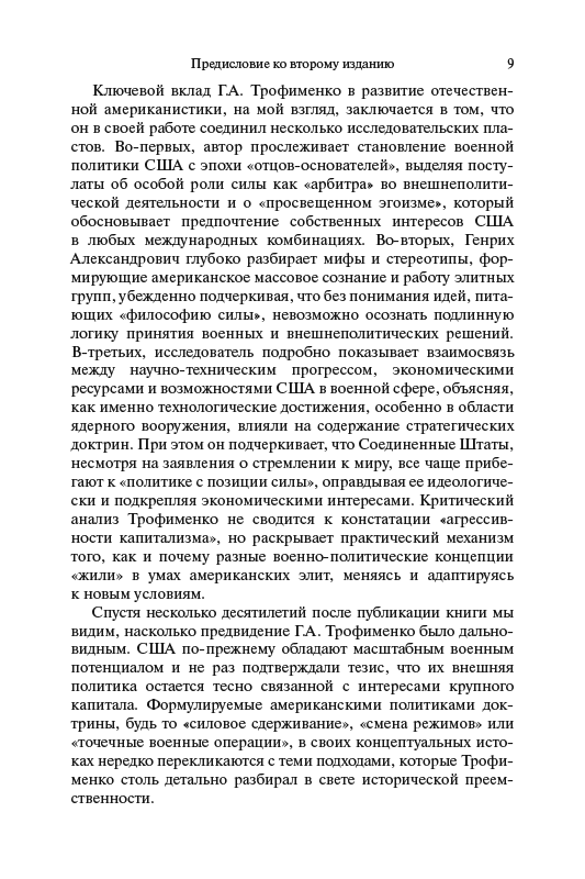 Книга доктора исторических наук Г.А. Трофименко (1929–2005) впервые вышла в свет в 1976 г. В ней автор – руководитель отдела внешнеполитических проблем Института США и Канады АН СССР – исследовал эволюцию военно-политической мысли США. Это исследование получило высокую оценку в научной и экспертной среде. Книга стала вершиной научного творчества Г.А. Трофименко. Оказалось, что, несмотря на прошедшие с момента ее публикации полвека и драматические изменения в архитектуре мировой политики, она до сих пор сохраняет свою актуальность. Более того, эти изменения только добавляют глубины наблюдениям и выводам автора. Конечно, значительная часть терминологии автора, его приверженность советским идеологическим клише 70-х годов прошлого века накладывают отпечаток на современное восприятие текста. Однако редактор и издательство сочли возможным не вносить никаких существенных изменений в изначальный текст книги за исключением исправления некоторых опечаток, а также написания ряда имен собственных.