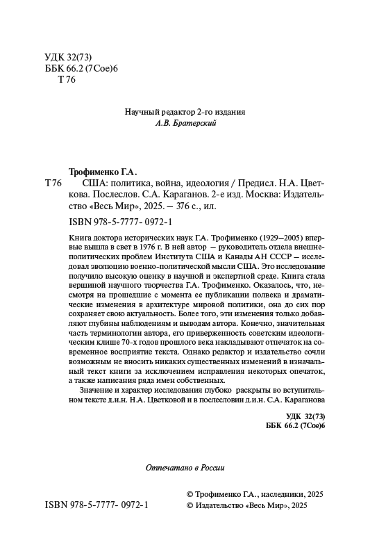 - Сфера международных отношений как никакая другая зависит от новостной ленты информагенств и СМИ. Все быстро возникает и тут же меняется. Однако, национальные интересы, особенно великих держав, меняются значительно реже. Книга Г. А. Трофименко, одного из выдающихся советских специалистов в области международных отношений, крупного знатока американской военно-политической стратегии «США: политика, война, идеология» была издана в далеком 1976 году. Но прочтите ее и вы поразитесь тому, как много она может поведать о дне сегодняшнем. Об этом хорошо и емко сказано и.о. директора ИСКРАН доктором исторических наук Н. А. Цветковой и учеником Трофименко научным руководителем факультета мировой экономики и мировой политики НИУ ВШЭ Сергеем Карагановым.