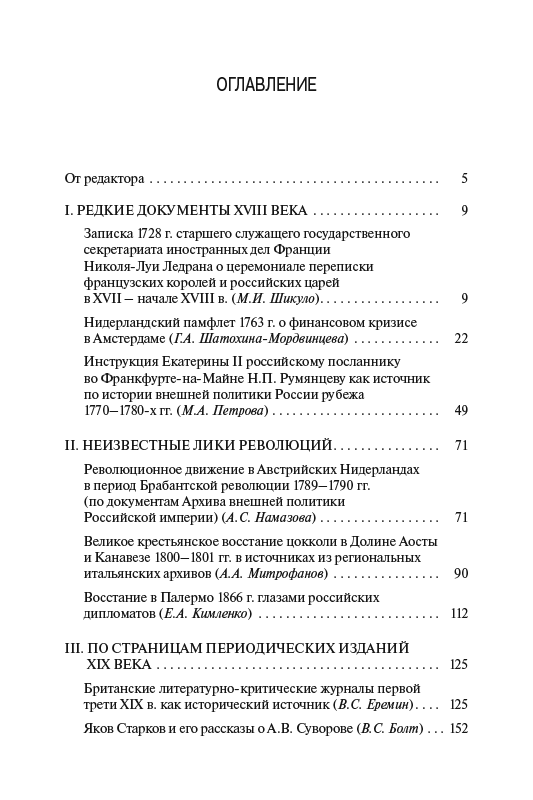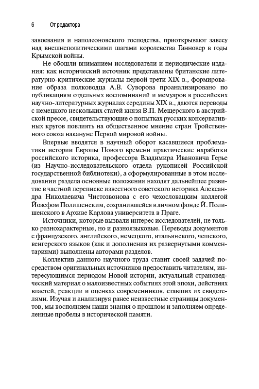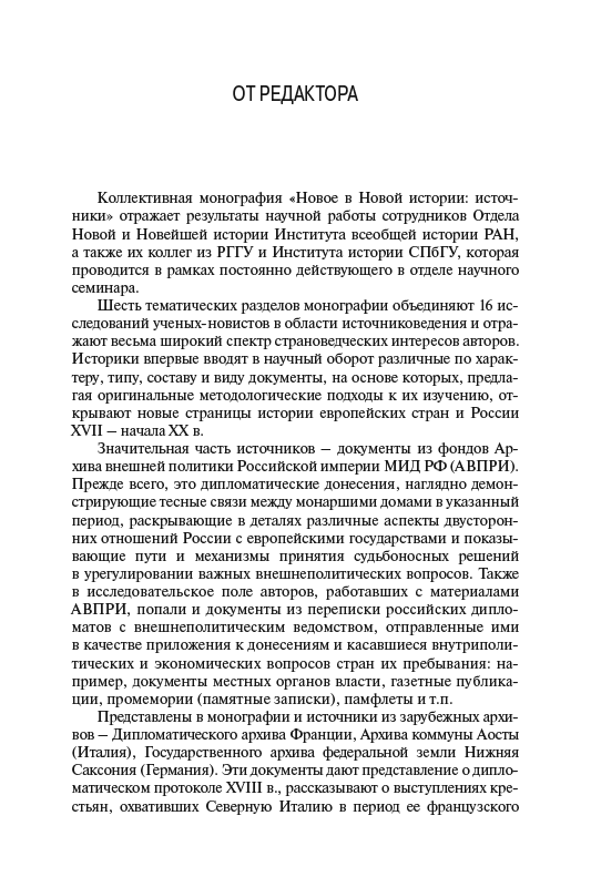 Авторы книги, сотрудники ИВИ РАН, РГГУ и СПбГУ, ставили своей задачей представить актуальный страноведческий материал о малоизвестных событиях европейской и отечественной истории. Шесть разделов книги объединяют 16 источниковедческих исследований. В них впервые вводятся в научный оборот разные по характеру, типу, составу и виду документы, на основе которых авторы открывают новые страницы истории европейских стран XVII – начала XX в. Значительная часть источников – документы из фондов Архива внешней политики Российской империи МИД РФ (АВПРИ). В книге представлены также источники из зарубежных архивов – Франции, Италии, Германии. Авторы исследовали и периодические издания как источники по конкретным темам: британские литературно-критические журналы первой трети XIX в., российские научно-литературные журналы середины XIX в., австрийскую прессу начала XX в. Впервые введены в научный оборот некоторые неизвестные ранее практические наработки российского историка В.И. Герье, а также имеющие к ним отношение материалы частной переписки советского историка А.Н Чистозвонова с его коллегой из ЧССР Й. Полишенским из Архива Карлова университета в Праге.