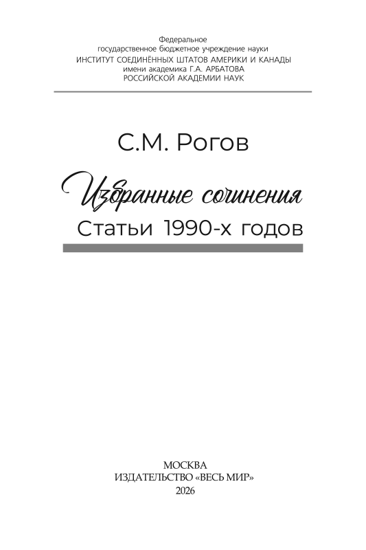 - Вышел в свет первый том избранных работ выдающегося ученого-американиста, академика РАН, многолетнего директора и научного руководителя Института США и Канады РАН Сергея Михайловича Рогова (1948–2025). В книгу вошли научные статьи 1990-х гг. С более чем четвертьвековой дистанции отчетливо видно насколько точными были оценки ученого, насколько верными оказались многие его прогнозы и рекомендации. Книга открывает собрание избранных сочинений С. М. Рогова.