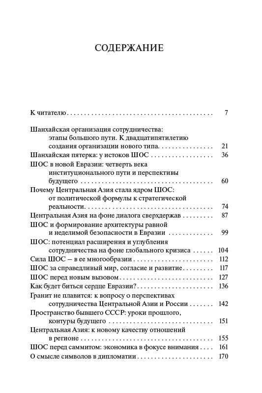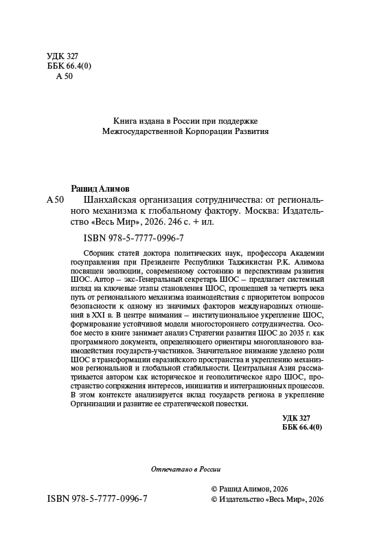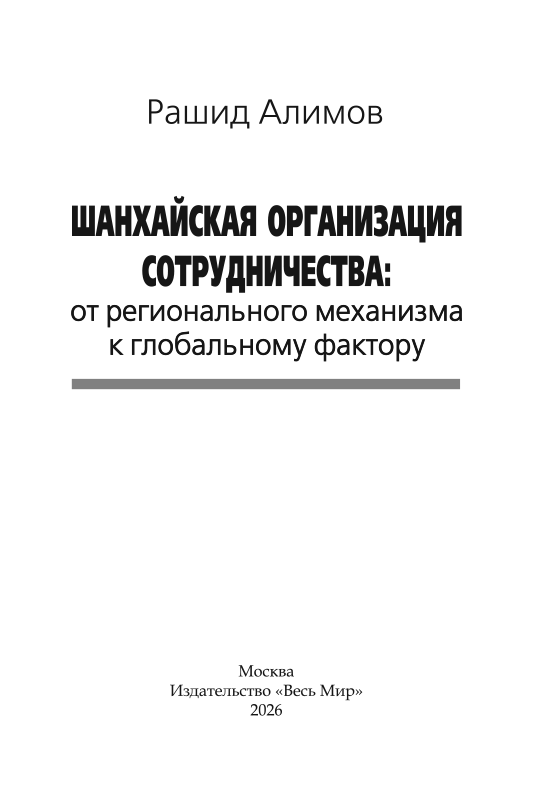 Сборник статей доктора политических наук, профессора Академии госуправления при Президенте Республики Таджикистан Р.К. Алимова посвящен эволюции, современному состоянию и перспективам развития ШОС. Автор – экc-Генеральный секретарь ШОС – предлагает системный взгляд на ключевые этапы становления ШОС, прошедшей за четверть века путь от регионального механизма взаимодействия с приоритетом вопросов безопасности к одному из значимых факторов международных отношений в XXI в. В центре внимания – институциональное укрепление ШОС, формирование устойчивой модели многостороннего сотрудничества. Особое место в книге занимает анализ Стратегии развития ШОС до 2035 г. как программного документа, определяющего ориентиры многопланового взаимодействия государств- участников. Значительное внимание уделено роли ШОС в трансформации евразийского пространства и укреплению механизмов региональной и глобальной стабильности. Центральная Азия рассматривается автором как историческое и геополитическое ядро ШОС, пространство сопряжения интересов, инициатив и интеграционных процессов. В этом контексте анализируется вклад государств региона в укрепление Организации и развитие ее стратегической повестки.