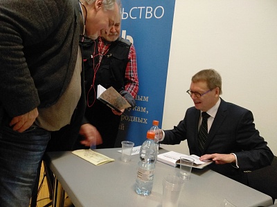 Настоящий «марафон» мы вольно-невольно устроили нашему автору 29 ноября. В 16 часов — встреча с читателями (было много студентов-скандинавистов, историков и лингвистов) в магазине Библио-глобус, а в 19 часов — встречи в Авторском зале книжной выставки.